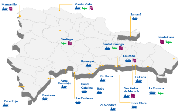 Puertos, Aeropuertos y oficinas donde operamos en República Dominicana. Ver Puertos 18 Puertos 5 Aeropuertos 7 Oficinas Puertos AES Andrés Itabo Puerto Plata Azua La Cana Punta Catalina Barahona La Romana Río Haina Boca Chica Las Calderas Samaná Cabo Rojo Manzanillo San Pedro de Macorís Caucedo Palenque Sto. Domingo